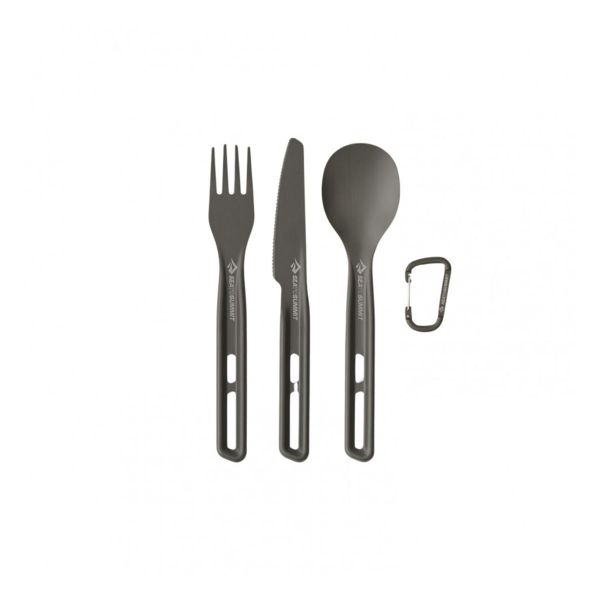 This ultralight cutlery set comprises a fork, spoon and knife, all linked by a carabiner.
