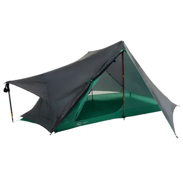 Its structure supported by 3 trekking poles achieves featherlight weight while maintaining excellent stability. The asymmetric architecture with external support maximises interior volume and simplifies pitching. This design makes the most of the living space for two people and their gear.