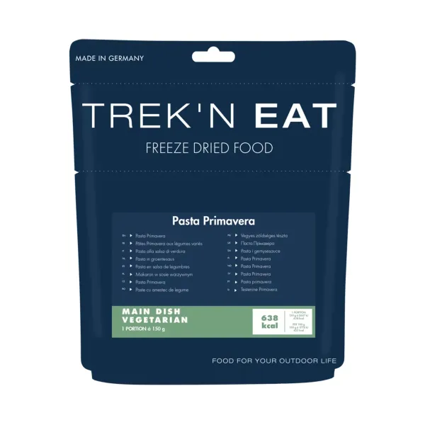 Trek'n Eat primavera pasta is made without additives and has a long shelf life. Packed in a convenient resealable pouch, it slips easily into a rucksack.
