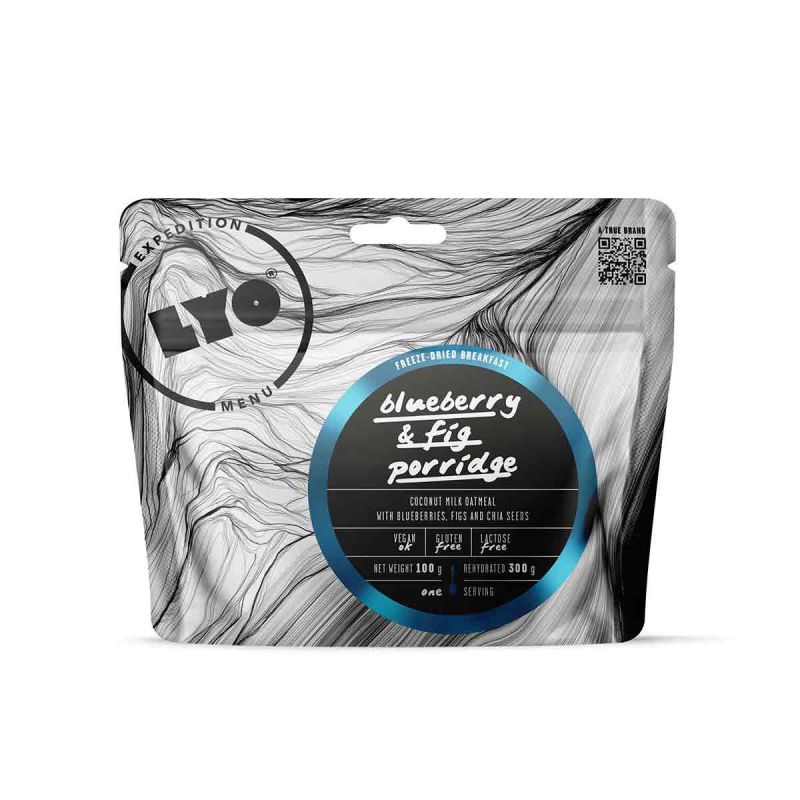 The blueberry and fig oat porridge is a 100g freeze dried meal before rehydration, perfect for your hiking bivouacs or expeditions. This 469 kcal freeze-dried product for rehydration, high in fats, is ready in just 10 minutes.