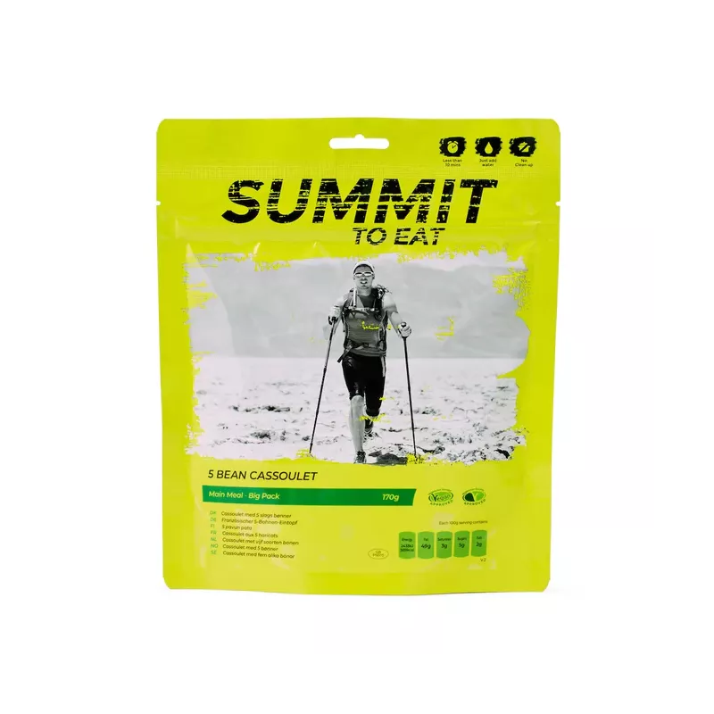This five-bean cassoulet dish is a vegan, lactose-free and gluten-free recipe prepared by British brand Summit To Eat. It's a freeze dried meal in double portion format, meaning this pouch contains approximately 1000 Kcal of food to share between two or enjoy alone during an expedition requiring high energy.