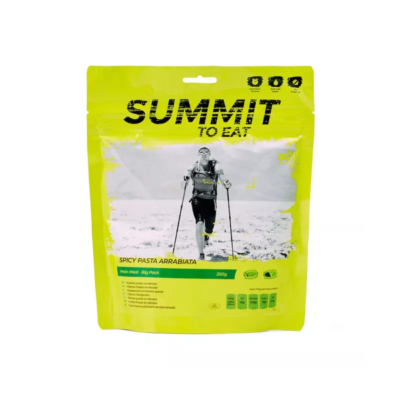 Summit To Eat's spicy arrabiata pasta — Double portion is a freeze dried dish designed for substantial and flavourful outdoor meals. This recipe combines pasta with a garlic and chilli tomato sauce, inspired by Italian cuisine. Made from 100% natural ingredients, the meal is cooked before being freeze dried to preserve its flavours and make it easy to carry.