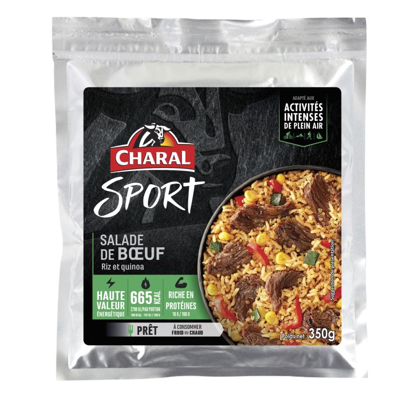 The beef, rice and quinoa salad is a sterilized meal from Charal Sport. It accompanies you during outdoor activities and provides an important energy source. It can be consumed both hot and cold. This sterilized meal is high in protein and calories.